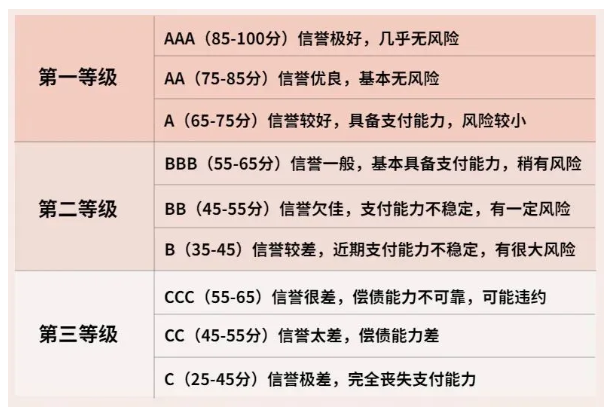 AAA级信用企业是评级机构按照一定的方法和程序在由中国名牌产品认证服务中心、中国中小企业协会委员会,联合推行的企业信用评定证书,是在对企业进行全面了解和分析的基础上,做出有关其信用行为的可靠性、安全性程度的评价,并以专用符号或简单的文字形式来表达的一种信用服务,企业信用评级能够客观公正地反应发证对象按合同约定如期履行债务或其他义务的能力和意愿。中小企业信用等级划分为A\B\C三等九级:
